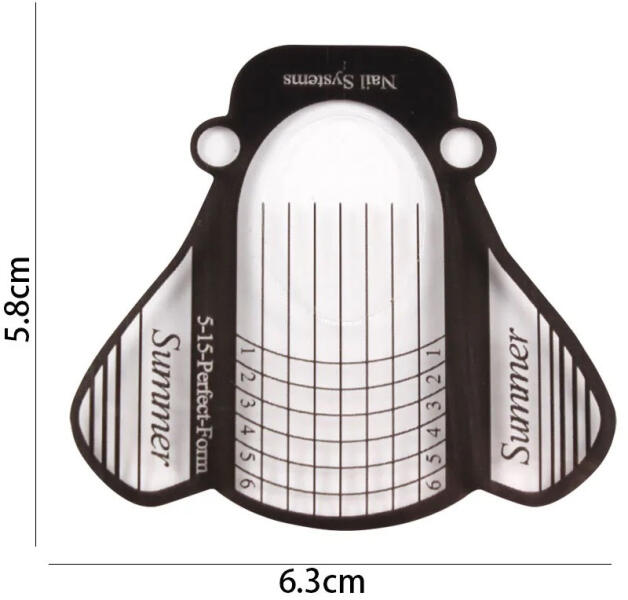 A műköröm sablon egy olyan eszköz, amely lehetővé teszi, hogy a saját körmeidre vagy ügyfeleid körmeire műkörömöt készíts. A sablon olyan mint egy kis matrica, amely a körömre helyezhető, majd a műköröm anyag felvitele után eltávolítható. A sablon használata egyszerű. Először a körömre kell felvinni a sablont, amelynek megfelelően kell illeszkednie a köröm méretéhez és formájához. Ezután fel kell vinni a műköröm anyagot, amely lehet akril vagy zselé, a sablonra és a körömre. Miután a műköröm anyag megszáradt, eltávolíthatjuk a sablont, és a köröm tökéletesen elkészült. A műköröm sablon használata ideális lehet azoknak, akik szeretnének műkörömöt készíteni, de nehézséget okoz számukra a köröm formázása vagy az egyenletes felvitele. Használata segít a precíz kialakításban és egyenletes felvitelben, így garantálja a szép és tartós műkörömöt. mérete : 6,3x5,8cm